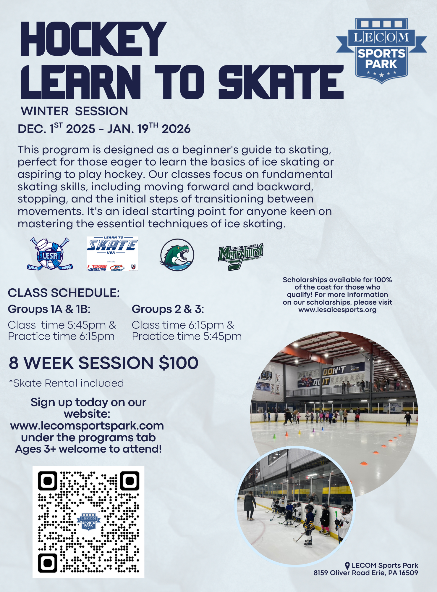 Furthermore, we strongly recommend that skaters wear gloves, a warm jacket, and flexible athletic clothing for both classes and practice sessions.