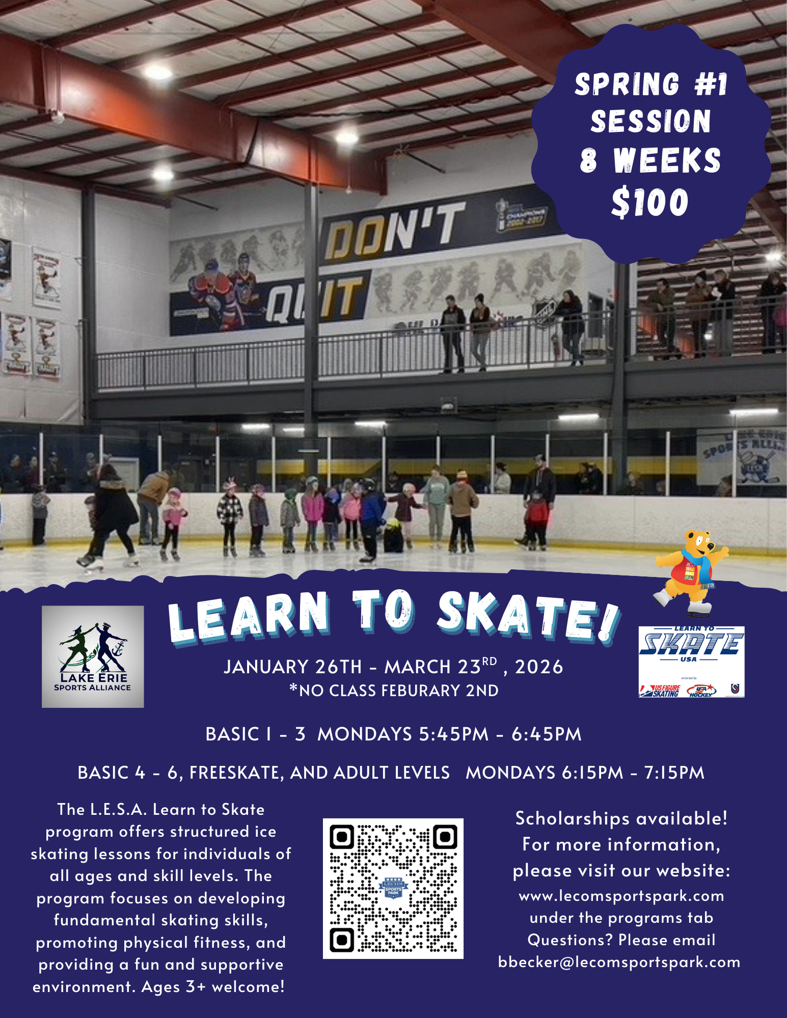 The Lake Erie Sports Alliance's Learn to Skate program offers structured ice skating lessons for individuals of all ages and skill levels. The program focuses on developing fundamental skating skills, promoting physical fitness, and providing a fun and supportive environment. Participants receive instruction from experienced coaches, with lessons tailored to beginner through advanced levels. The program emphasizes safety, skill progression, and fostering a love for ice skating.